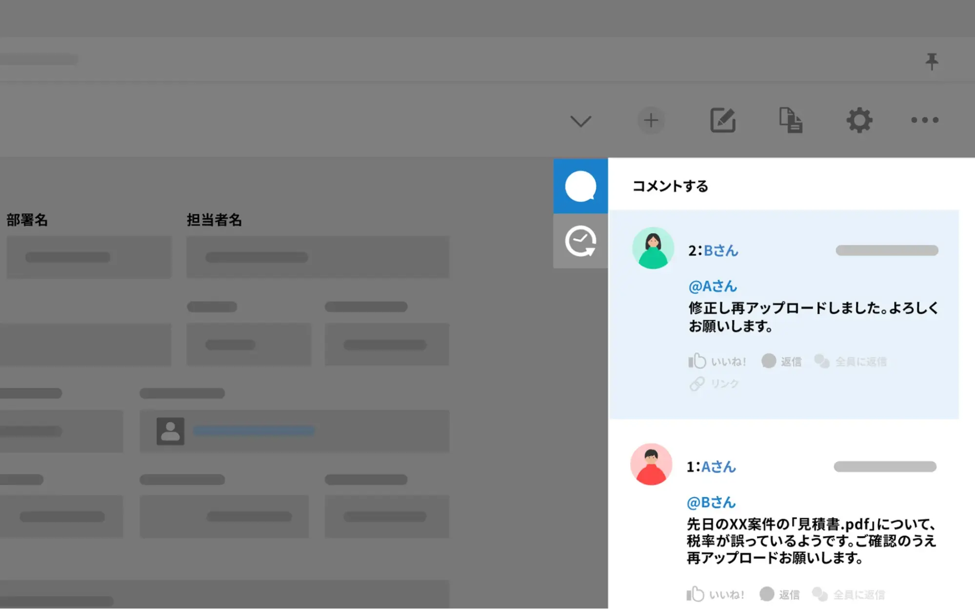 例えば、添付された見積書があるレコード上で、書類の作成担当者にメンションを付けて「見積書の○○に誤りがあるので修正をお願いします」と通知したり、対応後に「修正が完了しました」と返信したりすることが可能です。