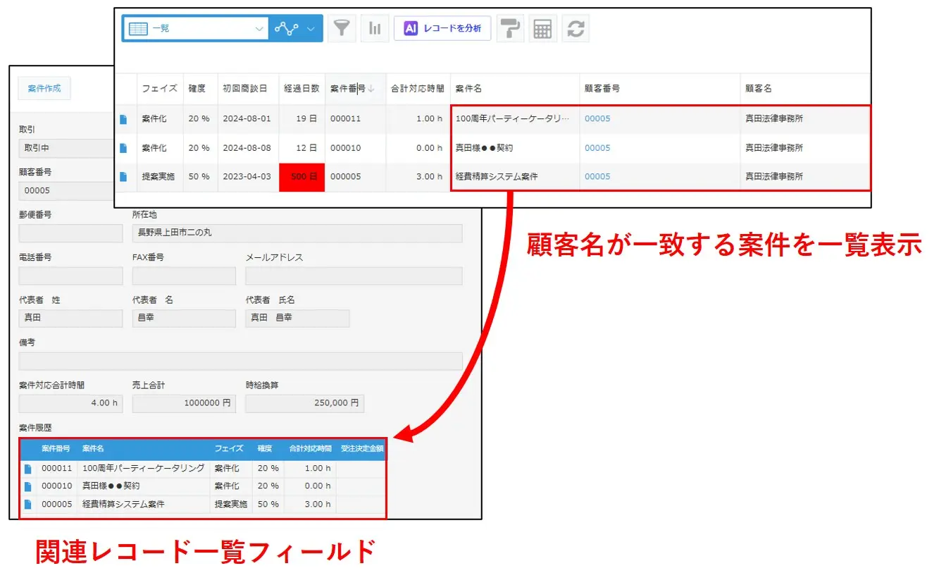 例えば、案件管理アプリで顧客情報を、別のアプリで会議の議事録を管理している場合でも、両アプリのレコードを紐づけておけば、案件管理アプリ上から議事録を参照することが可能です。