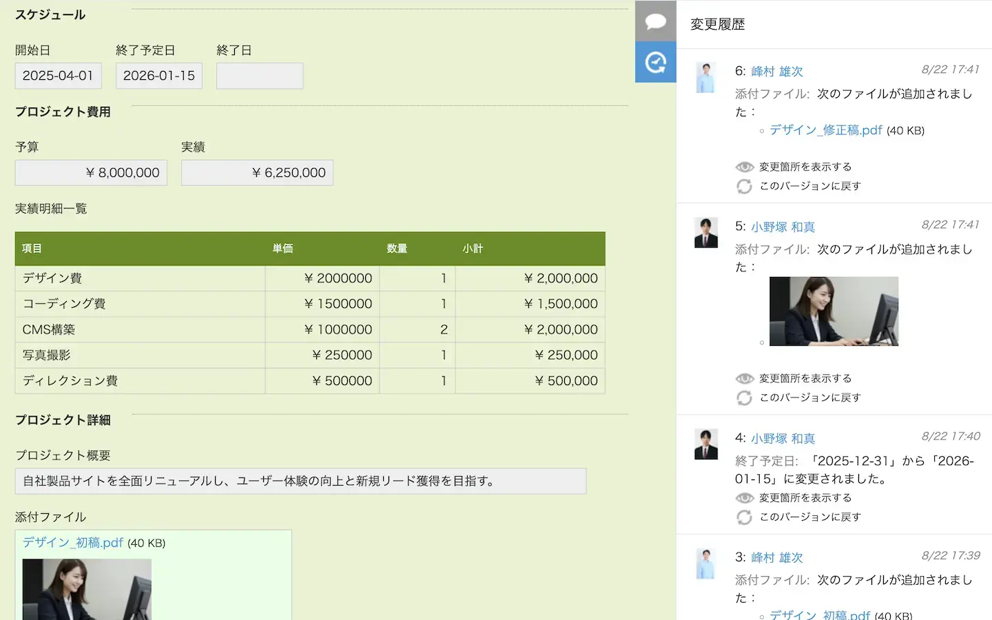 kintoneでは、ファイルの変更履歴が自動で記録されます。誰がいつ、どのように編集したのかが可視化されるため、情報管理の透明性が高まります。
