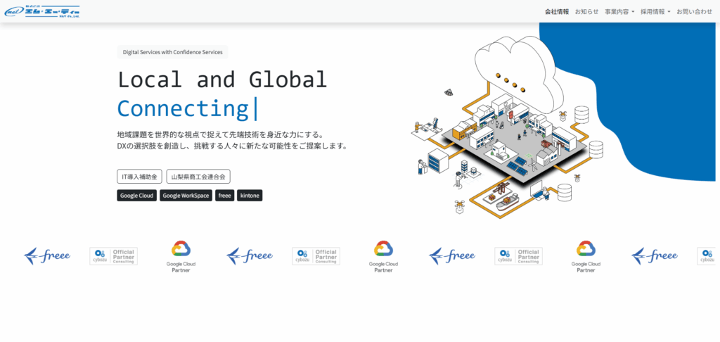山梨県甲府市を拠点に、地域課題を世界的な視点で捉え、先端技術を身近な力にするDXアドバイザー企業です。Google Cloud Partnerとして、Google Workspaceなどの各種SaaS導入支援や、基幹システム開発を通じて、地域社会のDXに選択肢を創造することを目指しています。特に「IT導入補助金」の支援事業者として、中小・小規模事業者のITツール導入と業務効率化・売上アップをサポートしているのが大きな特長です。