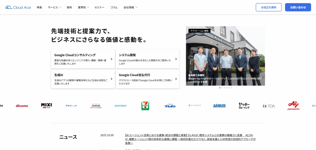 Google Cloudを専門とするMSP(Managed Service Provider)パートナーであり、導入から活用までワンストップで支援する企業です。国内で最初にMSPパートナーに認定され、300名以上のGoogle Cloud資格保持者を擁しています。Google Cloudのコンサルティング、システム開発、データ分析基盤構築に強みがあり、近年は生成AI(Geminiなど)の活用支援やAIエージェント導入にも注力し、お客様のビジネスにさらなる価値と感動を提供しています。