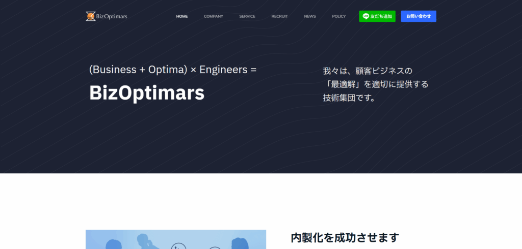 BizOptimars株式会社は、「Business + Optima = Engineers」の理念のもと、お客様のビジネスに対して最適な技術ソリューションを提供する技術集団です。特に、システム導入から内製化への移行を支援し、多くの企業や団体に内製化文化を根付かせてきた実績を有しております。技術を通じて業務改善と持続可能な成長をサポートすることを使命としています。